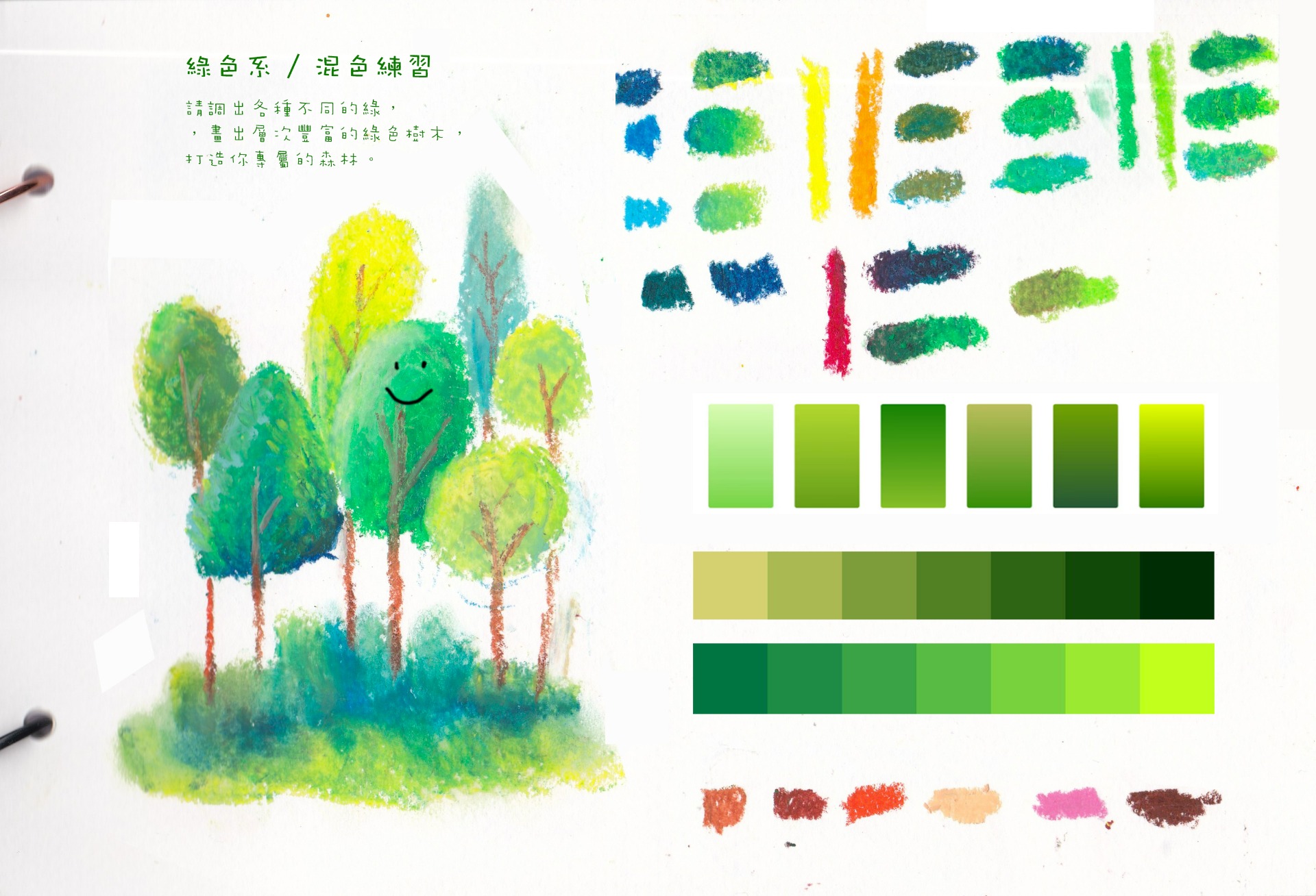 1. 練習調出不同「綠」:亮草綠:先上一層淺黃 ➜ 疊淺綠
